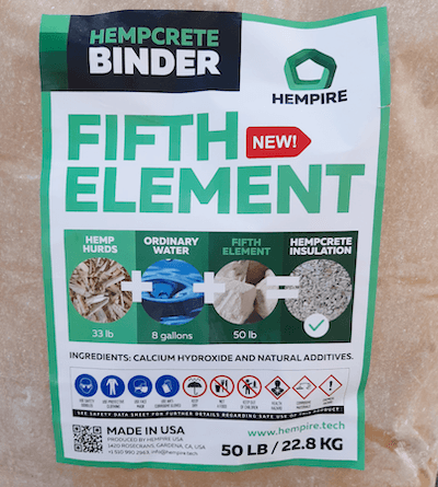 Fifth Element Binder is a proprietary mineral binder developed for hemp-lime construction systems. It is designed to combine with hemp shiv to create hempcrete wall systems and prefabricated elements. The binder replaces traditional hydraulic lime formulations within the Hempire system. Mechanical and fire performance values are not published on the product webpage. The binder integrates within monolithic hemp-lime wall assemblies.